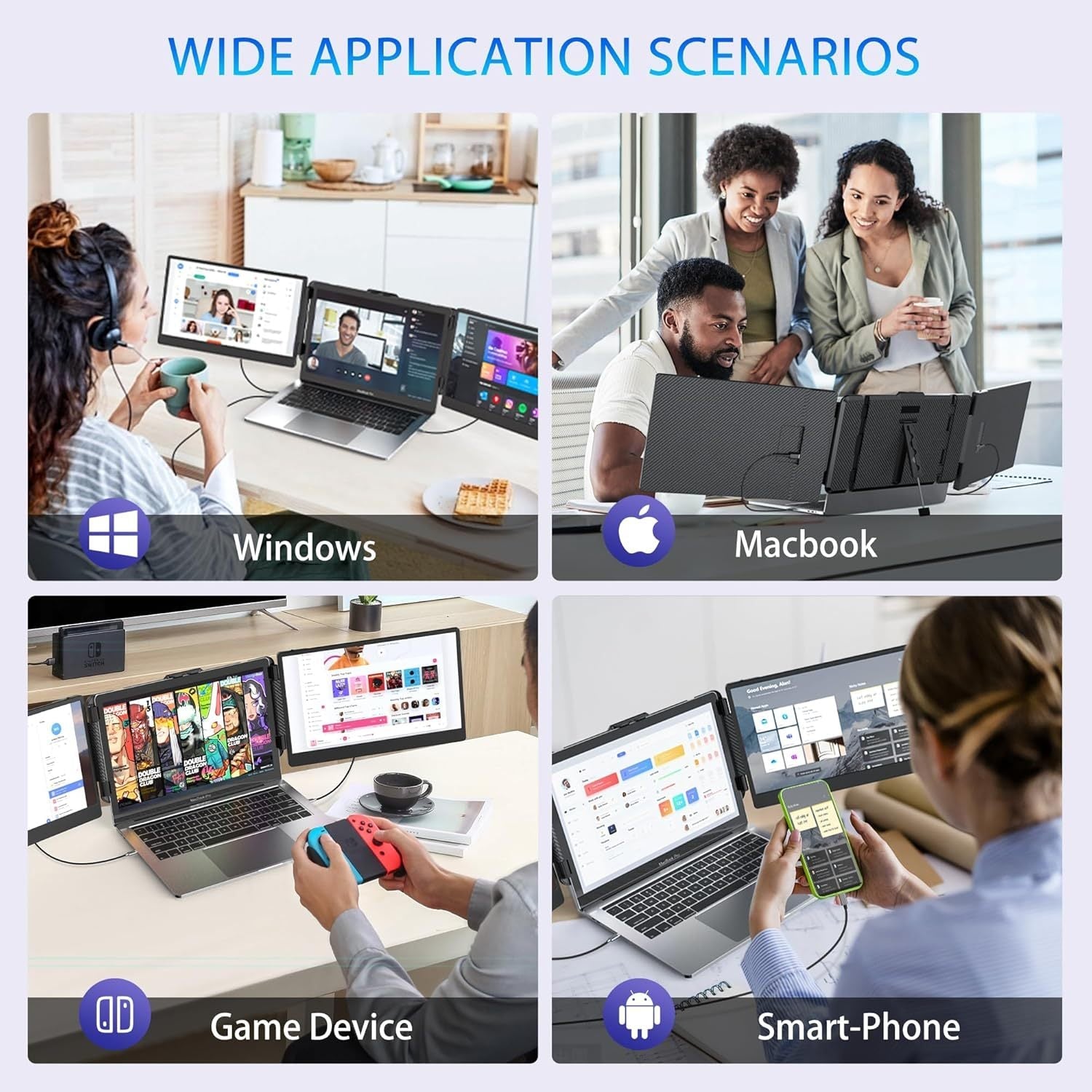 Triple-Screen Expansion – Instantly turn your laptop into a 3-monitor workstation. Dual 14” side screens support both extension and mirror modes, allowing you to work on multiple tasks simultaneously and boost productivity by up to 300%.